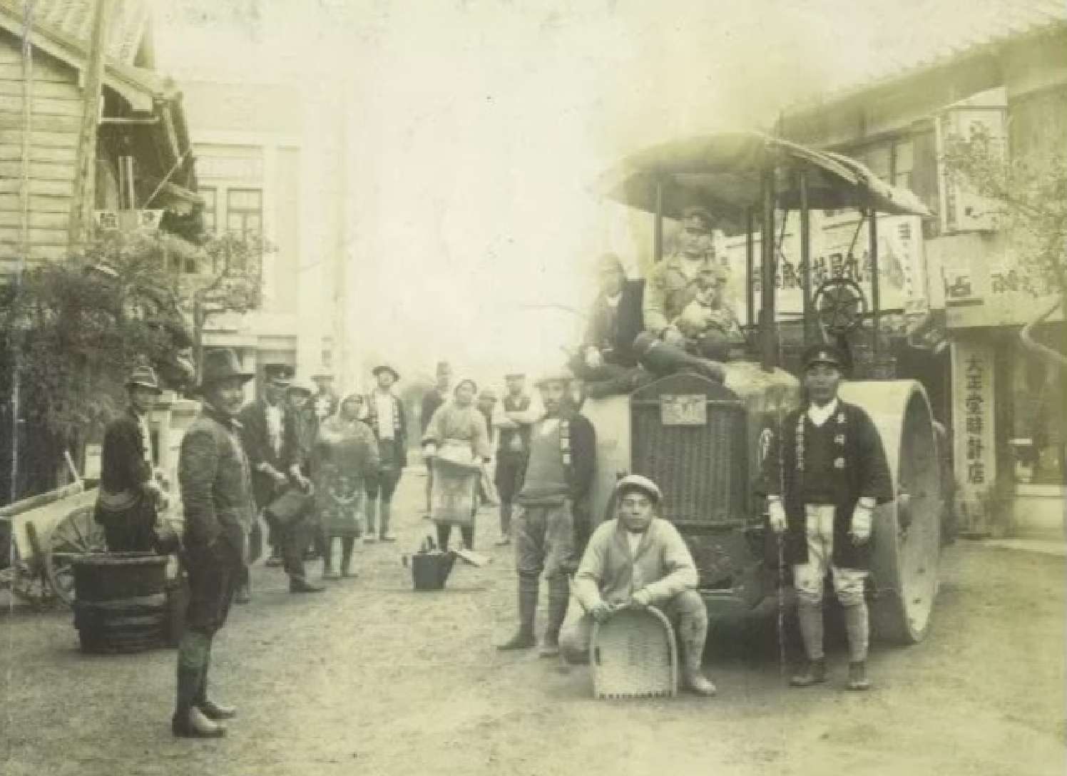 左手一番手前が創業者の星野兼平、右の重機ローラーに乗って犬を抱いているのが2代目社長星野國盛です。樽につめられたアスファルト乳化剤、これを散布する柄杓や専用のバケツなど当時の道路舗装工事の様子がうかがえます。
